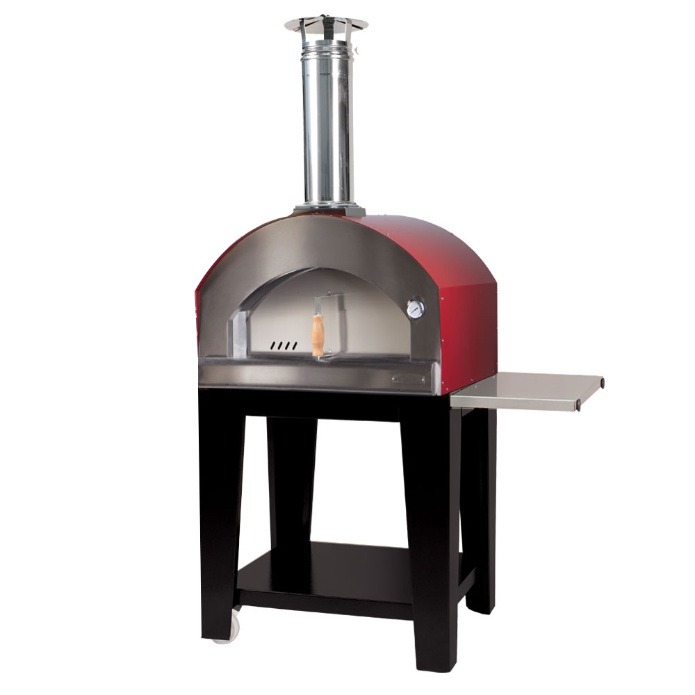 Frontale in acciaio inox. Carter di copertura verniciato rosso, marrone o nero. Carrello indipendente in acciaio o verniciato nero.